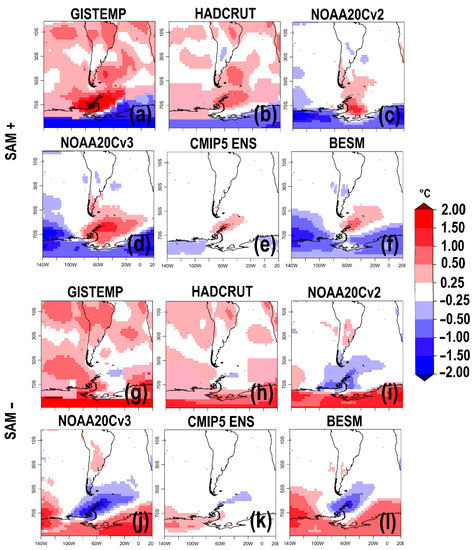 Surface temperature anomalies composites according to SAM phases. (a–f), positive SAM; (g–l), negative SAM. Composites were obtained by averaging temperature anomalies in months with SAM standardized index values higher than |2|. Temperature values are in celsius (°C). Datasets: (a,g), Marshall SAM index and GISTEMP; (b,h), Marshall SAM index and HadCRUT; (c,i), NOAA-20Cv2; (d,j), NOAA-20Cv3; (e,k), CMIP5 ensemble meanr.