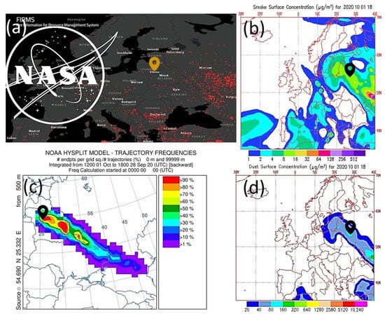 During the 1–3 of October boundary layer depth and vertical mixing significantly decreased creating suitable conditions for particle accumulation in the boundary layer (Figure 1). Concurrently, high mass concentration of PM10 (on average 132.9 µg m−3, measured at the nearest monitoring station) was registered. The European Union 24 h standard for PM10 is 50 µg m−3 and this concentration was exceeded by up to 2.7 times during those days (Figure 1). The reason behind the increased pollution level was air mass transport of particles from forest fires south-east of our measurement location. The Fire Information for Resource Management System (FIRMS) map revealed that several days before the air pollution event in Vilnius, a large area of forests were burning in the Luhansk region, Ukraine, near the border with Russia. Figure 2 shows active fire locations during the period of 30 September–3 October 2020. The gathered data agrees well with backward trajectories indicating that air mass from the wildfire location in the Luhansk region was transported over to Lithuania (Figure 2). Combination of obtained data from the Hybrid Single-Particle Lagrangian Integrated Trajectory model (HYSPLIT), Navy Aerosol Analysis and Prediction System (NAAPS) and FIRMS suggests that elevated aerosol concentrations in Vilnius were caused by smoke and dust particles brought from severe wildfire locations. Thus, we hypothesized the confluence of stable atmospheric conditions in the lower troposphere and the long-range transport of smoke and dust particles from the wildfire area led to the accumulation of high levels of airborne pollutants.