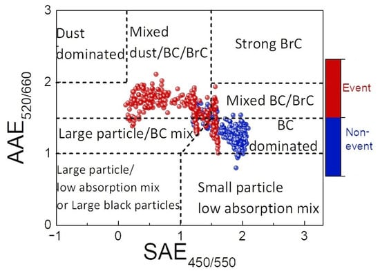 AAE and SAE space divided into segments based on Cappa et al. (2016). Blue dots represent non-event days, while red dots show data points during smoke event.