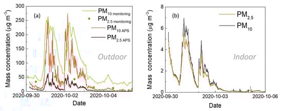 Particulate matter (PM) mass concentration of PM10 and PM2.5 in indoor (a) and outdoor (b) air.