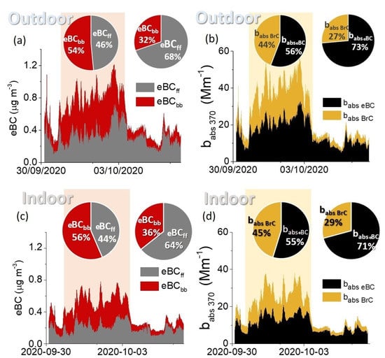 I/O of eBC and BrC were compared and are depicted in Figure 8c,d. Whereas I/O ratio did not significantly varied between event and non-event days, slight differences appeared within eBC species and BrC. I/O ratio on average was higher for eBCbb (0.73 and 0.71 during non-event and event days, respectively) than for eBCff (0.64 for both periods). Meanwhile babs BrC showed somewhat higher I/O ratio (0.75 and 0.70 during non-event and event days, respectively) than babs eBC (0.67 for both periods). On average, all eBC and BrC related I/O ratios were significantly higher than for PM2.5. Because I/O ratios of both babs eBC and babs BrC were very similar, the reason for higher I/O could not be related to aerosol chemical composition. Therefore, the size of eBC should be considered. Eriksson et al. (2017) [40] showed that fresh traffic dominated BC plumes were up to 1 µm size with the peak at 0.4–0.5 µm. Another study conducted by Ning et al. (2013) [41] estimated that eBC mass distribution from fresh diesel emissions show a mode of about 0.2 µm but due to both internal and external mixing of soot particles an increase in size occurred quickly upon release to the atmosphere. In addition, Cheng et al. (2018) [42] observed that fresh eBC from biomass burning plumes was characterized by particles around 0.2 µm. Therefore, the higher I/O ratio observed for eBC was likely caused by lower removal rate of smaller particles. As a result, more eBC reached indoor air and skewed PM2.5 chemical composition. As can be seen in Figure 9, while eBC contributed from 4% to 10% (during event and non-event days, respectively) of the total PM2.5 mass concentration in outdoor air, eBC fraction in indoor PM2.5 was much higher (31% and 33% during non-event and event days, respectively). The smoke event caused an increase in eBCbb contribution to total PM2.5 mass concentration by 8% in indoor air. Thus, eBC from local pollution and long-range transport smoke affects indoor air quality. Therefore, because of negative health effects of eBC, an improved filtration system should be considered for office buildings. In addition, the importance of eBC to indoor air quality was not observed via PM2.5 mass concentration measurements. This suggests that in order to ensure higher quality of indoor air, eBC mass concentration should be monitored separately.