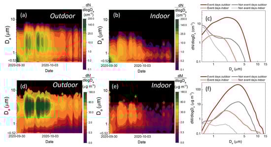 Particle number size distribution in outdoor (a) and indoor (b) air together with their averages for the event and non-event days (c). Particle mass-weighted size distribution in outdoor (d) and indoor (e) air together with their averages for the event and non-event days (f).