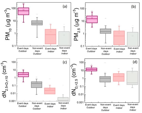 Box charts of PM10 (a), PM2.5 (b), particle number concentration of coarse particles (dN2.5<D<10) (c) and particle number concentration of fine particles (dND<2.5) (d) during event and non-event days in indoor and outdoor air.