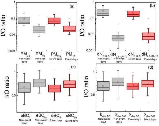Box charts of indoor/outdoor (I/O) ratios of PM2.5 and PM10 (a), particle number concentration of big (dN2.5<D<10) and smaller particles (dND<2.5) (b), eBCff and eBCbb (c), babs eBC and babs BrC (d) during event and non-event days in indoor and outdoor air.