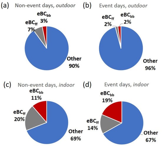 After applying aethalometer and wave-depended models to both indoor and outdoor air data, eBC levels were compared (Figure 5). Outside the event days, eBC mass concentration from fossil fuels origin (eBCff) was dominating in both outdoor and indoor air (68% and 64%, respectively). These findings are consistent with our previous study of organic aerosol (OA) and eBC source apportionment in Vilnius outdoor air [38] which revealed that during the non-heating season, traffic-related OA contributed to the PM1 fraction by 10% and the contribution of eBCff to total eBC was dominant (up to 92%).