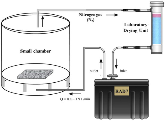 Figure 1 illustrated the method used in this study to evaluate radon exhalation rates from building materials. Based on the small chamber method, a 20 L chamber was used to maintain the temperature and relative humidity (RH) inside the chamber at 25 °C and 10% or less, respectively, while the test period was set to 99 h, thereby overcoming the limitation of the conventional method that required extended hours. Furthermore, nitrogen gas, which is proposed as the carrier gas in ISO 11665-9, was used as the radon carrier gas in this study to minimize the error by increasing the background concentration, which could occur in the case of applying regular air as the carrier gas. It was assumed that the back-diffusion effect, which could be produced by the carrier gas, would not occur because the volume of the chamber was ten times larger than the volume of the sample [9,18,34].
