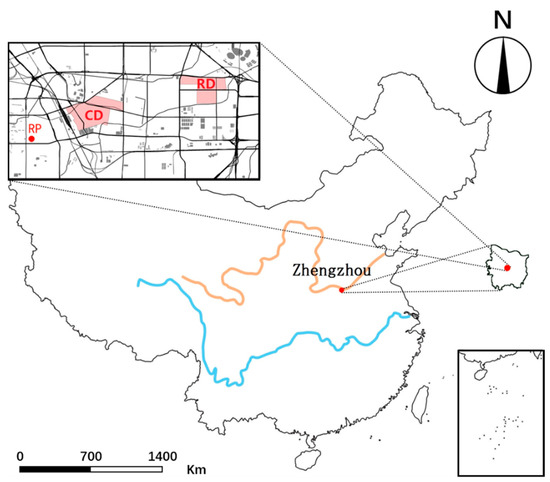 Locations of Zhengzhou city, sampling commercial district (CD), residential district (RD), and reference point (RP).
