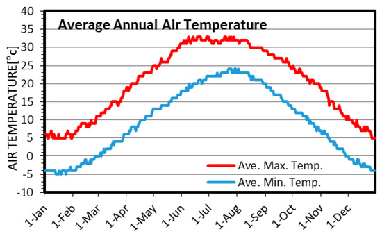 Average annual maximum air temperature and minimum air temperature of Zhengzhou (data source from http://www.weather.com.cn/forecast/history.shtml?areaid=101180101&month, accessed on 21 June 2021).