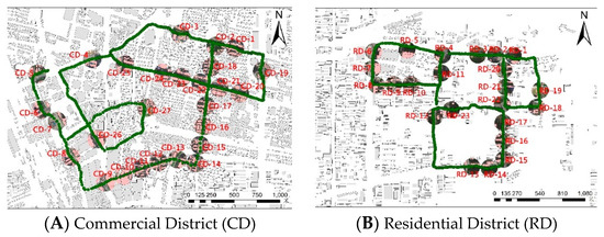 In this study, we selected the Er-qi commercial district to represent a typical commercial district in Zhengzhou. The circumference of the commercial district is approximately 7.4 km. The average building height is approximately 16 m. Roads are generally 4-lane arterials that are approximately 16 m wide. In the commercial district, we sampled 27 circular areas, each with a radius of 100 m; these 27 sampling circles’ BD range from 10.04 to 60.18%, with an average of 31.92%, PR is from 0.56 to 3.96, with an average of 2.02, BH ranges from 7.6 m to 28 m, with an average of 16.87 m, and GCR ranges from 0.72 to 41.81%, with an average of 15.67%; the locations of these sample sites are shown in Figure 3A. The mean specific indexes of urban spatial form for each sampling circle are shown in Table 1.