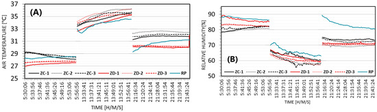 Four-day average (A) air temperatures and (B) relative humidity for six of the mobile measurement routes and for the reference point.
