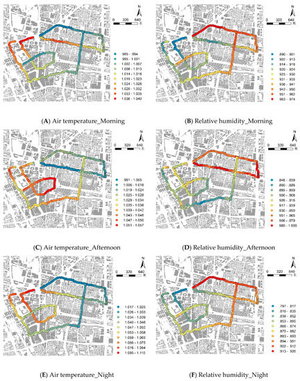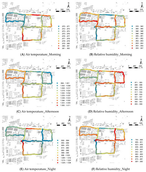 A negative relationship can also be found between morning relative humidity (max. and min.) and afternoon relative humidity (r values from −0.48 to −0.723) in Table 5, similar to the air temperature results. The reason for this negative result remains the same, which is that the key factors influencing the atmosphere were distinct at different times of the day. As shown in Table 6, GCR, which affects relative humidity by transpiration and evaporation, is the core index related to relative humidity in the morning (r = 0.589), afternoon (r = 0.409), and night (r = 0.471). In addition to GCR, PR and BH also had strong (r = 0.642) and moderate (r = 0.452) correlations with relative humidity in the afternoon. These results illustrate that, when comparing built-up areas with open space in this commercial district, built-up areas with higher PR and BH might have higher relative humidity, and we assumed that is just due to their lower air temperature.