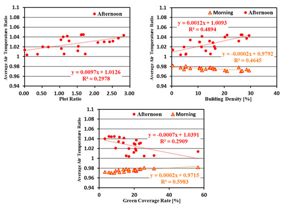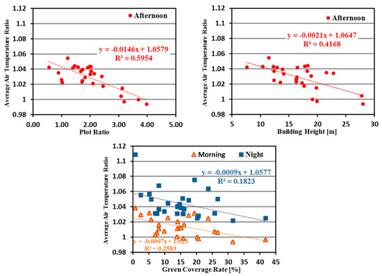 On the basis of Table 8, part of the data were fitted and are given in Figure 10. The fitting line’s slope is gentler in the morning than in the afternoon, which indicates that the thermal environment in the afternoon for this residential district is more affected by urban morphology than in the morning. Air temperature ratio was higher while BD was lower, and GCR was higher in the morning; on the contrary, during the afternoon, air temperature ratio was higher while BD was higher, and GCR was lower. We speculated that, due to the building shading effect, air temperature was lower in the area with building shelters in this residential district in the morning—whereas, in the afternoon, particularly at approximately 1:00 p.m., solar elevation was highest in a day’s period, building shading was not effective, and, moreover, an array of buildings blocked ventilation and heat dissipation. During night, air temperature had no connection with morning and afternoon air temperature, even with any index of urban morphology. Night air temperature in this residential district was almost 2 °C cooler than in the commercial district (shown in Figure 5), which illustrated that, for this residential district in this cold region city, heat was well dissipated during the night, and night air temperature was not affected by the surrounding built environment.