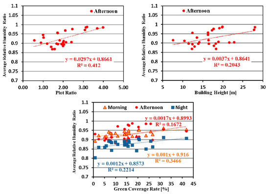 Urban morphology indexes that were related to the relative humidity ratio were selected, and orders and trends between the data are presented in Figure 9. As shown, relative humidity ratio is increasing while PR, BH, and GCR increase in the afternoon in this commercial district, whereas, in the morning and night, only GCR had an impact on that. Nevertheless, the slope of the fitting line for GCR in the afternoon is the highest, while the slopes for the morning and night are almost the same. Why is the humidification efficiency in the afternoon the highest? We speculated that the higher solar radiation of that moment than for the other two periods was the primary cause of this phenomenon.