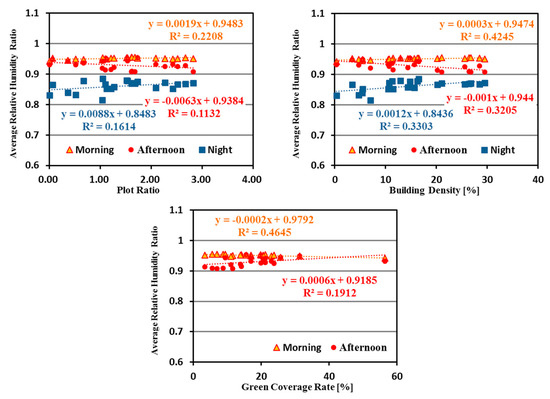 On the basis of Table 8, part of the data were selected and fitted; they are shown in Figure 11. From that figure, it is not difficult to find that the relative humidity ratio is more sensitive to urban morphology changes at night than in the other periods. However, no analogous results have been found in the commercial district. Traced to its cause, presumably this is because relative humidity in the commercial district is influenced by multiple factors, for instance, exhaust humidity from air conditioners of gigantic commercial buildings, metabolism of the crowded people, transportation, and large equipment in that area.
