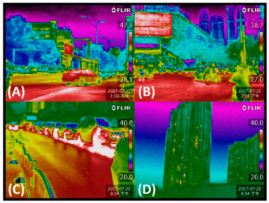 Infrared thermography of the Er-qi commercial district (A,B) and the Yanzhuang residential district (C,D).