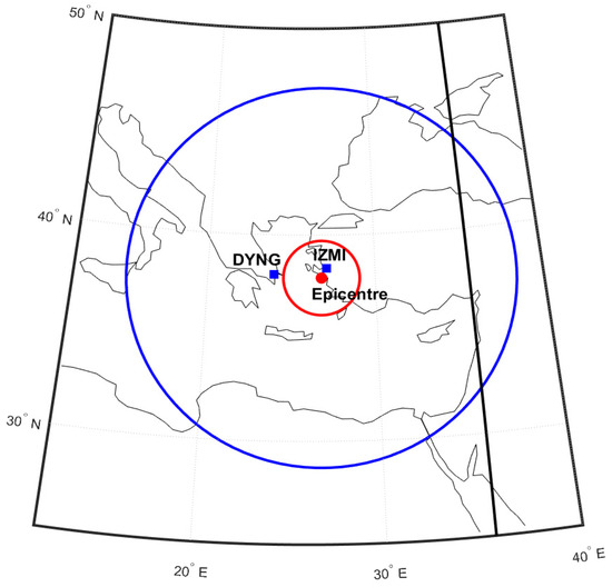In this manuscript, we investigate the multi-parametric approach for the 2020 Samos EQ, a very strong EQ that took place off the coast of the Northern part of Samos Island (Greece): M = 6.9, epicenter (37.9001 N, 26.8057 E), focal depth = 12 km, time of occurrence 11:51:57 UTC [93,94]. For the ground-based observation, we utilize two GPS-IGS stations (i) DYNG (38.078 N, 23.93 E) in Greece, and (ii) IZMI (38.39 N, 27.082 E) in Turkey, which are close to the EQ epicenter. The locations of the GPS-IGS stations (blue squares), the EQ epicenter (red disk), the EQ preparation zone (EPZ) (blue circle), and the critical zone (CZ) (red circle) are shown in Figure 1. The track of the Swarm satellite is also marked with a black line. The distance of the epicenter from DYNG and IZMI is 251 km and 58 km, respectively. The GPS-RINEX observation and navigation files are taken from the IGS NASA archive (https://cddis.gsfc.nasa.gov/gnss/information/daily, accessed on 22 November 2020). These GPS-RINEX data are fed in a software name “GOPI SEEMALA software” [95] and computed the Vertical Total Electron Content (VTEC) using Equations (1) and (2) [96,97,98].