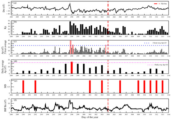 Figure 2. Daily variation of (a) Dst; (b) Kp; (c) 3-hour average Ap; (d) daily average Ap; (e) SID; (f) IMF-Bz from the day of the year 288 to 314. Solar active days are shown by a red bar, whereas solar quiet days are indicated by a black bar (for (ce)). The dashed red line denotes the EQ day. The blue dashed line represents the three-hour average Ap value of 25, and the magenta dashed line represents the daily average Ap value of 16.