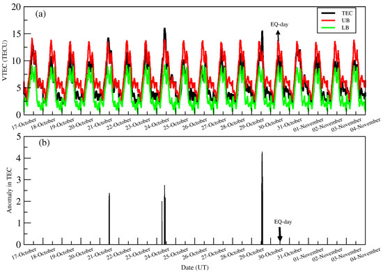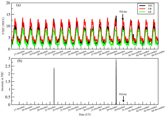 Figure 3. (a) The diurnal variation of TEC (black line) from 17 October to 4 November, the 2020 Samos EQ along with the upper (red line) and lower (green) bound (upper panel). (b) The lower panel shows the fluctuations in TEC. The day of the EQ is marked with an arrow.
