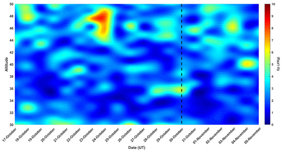 Figure 5. Potential Energy ( E p ) variation associated with with AGW from 17 October to 4 November 2020. Along the x- and y-axis, we present the date and altitude in km, respectively. The colorbar indicates the E p values in J/kg. The black dashed line indicates the EQ day.