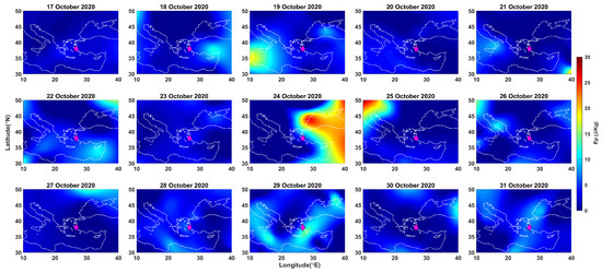 Figure 6 describes the spatial distribution of E p for the same time period. Here, the intensification of E p is projected on a two-dimensional map for which the latitude and longitude range from 30 N to 45 N and 10 E to 40 E with the EQ epicenter at approximately in the center (magenta diamond). We take the altitude of 47 km and present the E p values. Our selection of altitude follows the maximum enhancement in E p . It is evident from Figure 6 that maximum AGW activity is observed on 24 October 2020, near the EQ epicenter. The patch of AGW stays at the northeast of the epicenter and the maximum enhancement is found within the 500-km radius from the epicenter. On 25 October, a similar but much smaller patch is observed in an opposite direction of the epicenter.