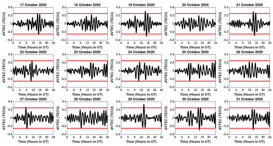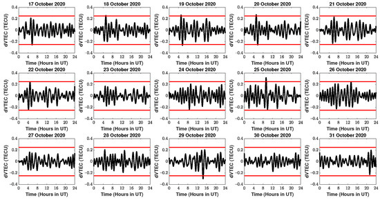 Figure 7. Diurnal variation of dVTEC (black curve) with the un-perturbed levels (red lines) from 17 to 31 November 2020 for DYNG station.