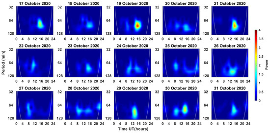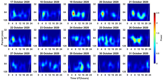 Figure 8. Scalogram from 17 to 31 October 2020 as computed from dVTEC variation for DYNG station. Along the x- and y-axis, the time (in hours) and wavelet period (in minutes) are plotted, respectively. The colorbar represents the wavelet power. The white line represents the cone of influence (COI).
