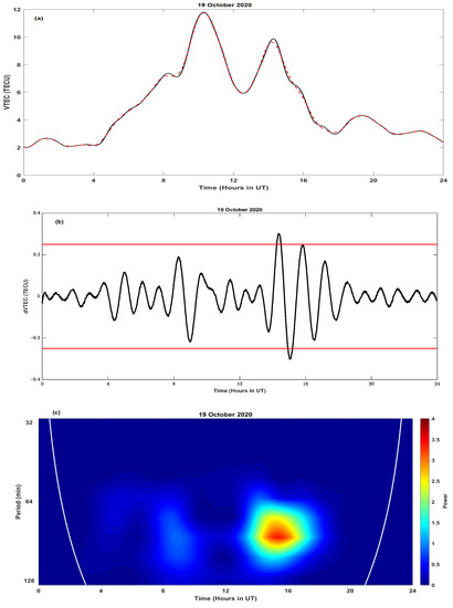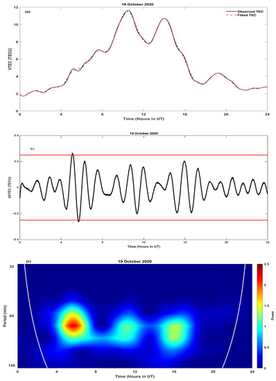 Figure 9. Diurnal variation of (a) VTEC (top), (b) dVTEC (middle), and (c) scalogram (bottom) for 19 October 2020. In the top panel, the black solid curve and the red dotted curve represent the observed and fitted TEC profiles, respectively.