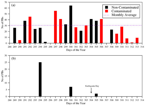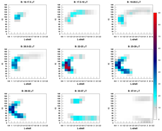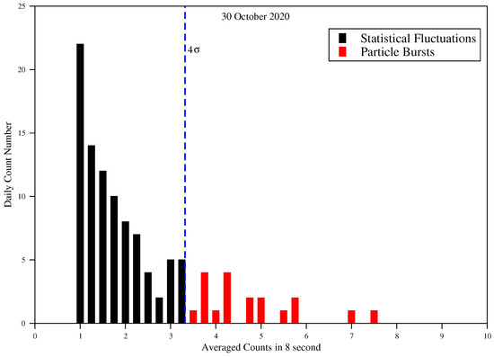 It is notable to us that a large EQ greatly affects radiation belt energetic particle counts and, for this reason, we have assembled NOAA satellite information. NOAA-15 satellite gives processed and raw data information, and we choose these datasets for a period of 26 days starting from 15 October 2020 to 9 November 2020. For the particle counts calculation, our initial step is to make another dataset on an everyday schedule. Each dataset contains time in milliseconds, latitude in degree, longitude in degree, MEPED (Medium Energy Proton Electron Detector) electron channel information (electron count rates for example CR’s), IGRF magnetic field (B), MEPED telescope pitch angle ( α ), and L values (McIlwain L-parameter). We average out these datasets every 8 s. To eliminate this cumulative sum in the newly-made datasets, we make a difference in the energy values and growing new energy channels according to our further computation. These new energy channels are 30–100 keV, 100–300 keV, and <300 keV; likewise, we exclude the energy values that contain zero. We make a three-dimensional matrix with L, α , and B values where the binning of L value is from 0.9 to 2.2 with a bin width of 0.1. The range of the pitch angle (0 to 180 ) is divided with 12 stages of 15 each. Geomagnetic field B is separated into nine ranges as follows: 16.0–17.5 μ T, 17.5–19.0 μ T, 19.0–20.5 μ T, 20.5–22.0 μ T, 22.0–25.0 μ T, 25.0–29.0 μ T, 29.0–33.0 μ T, 33.0–37.0 μ T, and 37.0–41.0 μ T and, by the utilization of this matrix, we need to count the high energetic particles included in each shell distinguished by the NOAA-15 satellite. Now, our next step of this computation is to make a condition for which the count rates are considered as particle bursts (PB’s). Based on the previous theory, the 8 s CR’s are consistent with Poisson distribution [82]. Thus, to determine the non-Poissonian fluctuation with 99% probability, the defined condition is 4 σ value. The energetic particle numbers which exceed this value are considered PB’s. Now, the seismic-induced PBs are selected by putting up the condition | Δ L | ≤ 0.1, where Δ L is characterized by the contrast between the L values related to EQ and particle bursts.