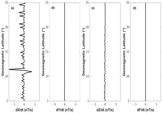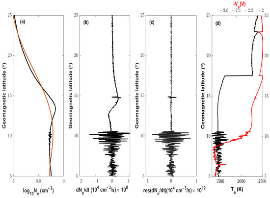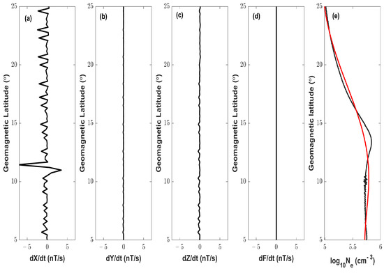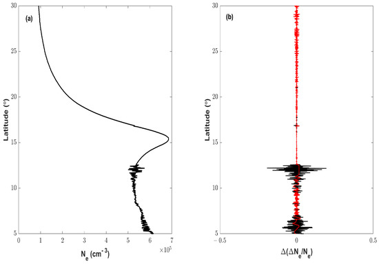 The deviation of d V T E C is obtained by subtracting the modeled profile from the original data. To obtained the modeled V T E C f profile, we utilize the sgolayfilt with polynomial order 5 and 90 min time window in MATLAB. We use the filtering in a large time window to remove the additional noise in the d V T E C . The small-scale fluctuations are computed by taking the difference between the observed and fitted values as shown in Equation (10) [58]: