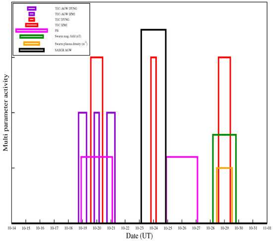 The time–altitude variation of E p with the associated AGW from 17 October to 4 November is shown in Figure 5. The altitude ranges from 30 to 50 km. The E p is presented as a color bar that ranges from 0 to 10 J/kg. This spatio-temporal profile indicates a significant amount of E p during 23 October to 25 October at around 46 km to 48 km altitude. The EQ day is marked with a black dashed line, and it is evident that the AGW activity is significantly enhanced around six to eight days before the EQ.