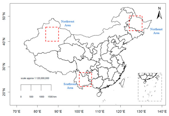 Study area comprising the northeastern, northwestern, and southwestern parts of China.