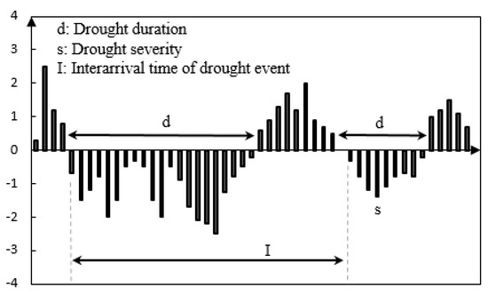 The schematic diagram in Figure 3 defines drought. A meteorological drought event is generally defined as the period in which the meteorological variable of interest is below a certain cutoff value. This interception level may either be constant or variable. Therefore, the important indicators of drought events define drought duration and severity.