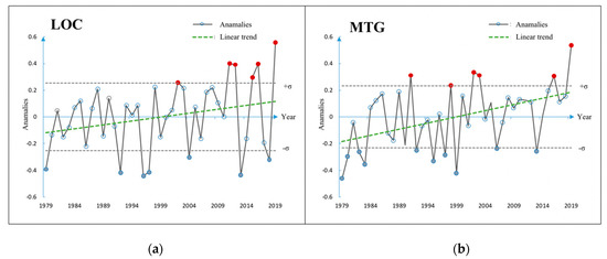 Time series of global temperature gradients. (a) LOC index. (b) MTG index during the period from 1979 to 2019. Green dotted line represents the linear trend of the indices. Gray dashed line indicates the +1 σ and −1 σ. For each gradient, red dots indicate significant positive events while blue dots indicate significant negative events.