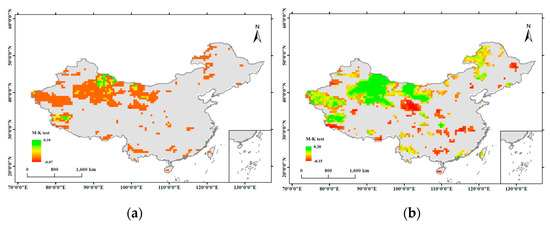 In the foregoing calculation, the original hypothesis H0 will be rejected when |ZC|≥ Z1–α/2. In this case, there is a significant upward or downward trend in the current time series data α confidence level. If ZC > 0, it shows an upward trend. If ZC < 0, it shows a downward trend. ±Z1−α/2 is the (1 − α/2) quantile of the standard normal distribution, and α is the test confidence level of the test. When |ZC| ≥ 1.64, 1.96, and 2.58, the α confidence values are 0.1, 0.05, and 0.01, respectively. Here, the MK test was used to analyze the drought characteristic across China, and the tendency was determined from the results of the p and z values. The trend is not significant when p > 0.05. However, the difference between the result and the zero hypothesis is evident when p < 0.05. Thus, the p-value can indicate whether the SPEI of the area has a significant change trend. The direction of trend is then determined based on the positive and negative S values.