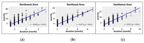 Relationship between drought duration and severity in the (a) southwest, (b) northeast, and (c) southwest.