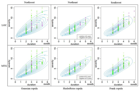 Copula distributions of drought duration and severity in positive (negative) LOC/MTG years.