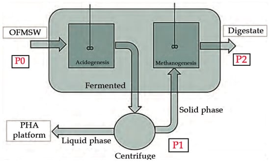 Anaerobic digestion (AD) is an economically advantageous technology for the treatment of organic waste and its management. It is a biological process that involves catalysis by anaerobic and microaerophilic microorganisms (typically thriving in 2–10% O2). It allows the degradation of organic biomass, leading to the production of biogas and digestate. The latter consists of the leftover indigestible matter and the microorganisms’ mass. AD has several noteworthy advantages, such as low production of sludge, low energy requirement, low operating costs, and potential energy recovery [9,10]. Anaerobic digestion technologies can be classified into continuous or batch operation, wet (total solids (TS) content <20%) or dry (TS content >20%) moisture levels, mesophilic (20–45 °C temperature range) or thermophilic (50–55 °C temperature range) conditions, and single- or two-stage digestion [10]. For PHA production, separation of acidogenesis and subsequent methanogenesis is needed. PHAs are synthesized in bacteria by using intermediates of the β-oxidation of alkanoic acids and accumulated in intracellular vacuoles during acidogenesis, then the growth conditions for selected PHAs producing microorganisms can be optimized [7]. Generally, for the organic fraction of municipal solid waste (OFMSW), thermophilic treatment can be used to guarantee higher effectiveness [11] and adequate management to guarantee pathogen reduction [12].
