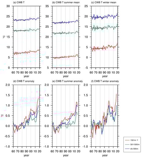 As for the seasonal mean temperature for each year, similar but smoother variations can also be seen in the analysis of the summer mean temperatures (Figure 1b,e). In the two lowest groups, the variations behave similarly to the annual mean temperature, while the changes stay relatively stable compared with the annual mean with a more consistent warming tendency since the 1990s. The most pronounced warming, again, appears in the highest group. The non-negligible warming since the early 1970s is substantially more prominent than those at lower altitudes. Although the warming stays relatively moderate during the 1980s and the early 1990s, the overall temperature-increasing trend is apparent. The variations behave more extremely, regardless of the altitude in the analysis of the winter mean temperature (Figure 1c,f). The results in the two lowest groups are nearly identical throughout the studied years, except for a slightly larger temperature decrease found in the group of 501 m to 1500 m in the mid-2000s. Despite a noticeable cooling seen in the 2000s, the most intense temperature increase again occurs in the group of above 1501 m.