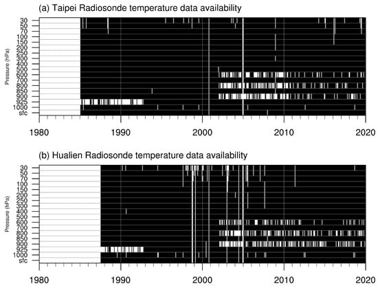 Nowadays, the most common method to fully explore the vertical profile of the upper atmosphere is to launch radiosonde balloons at a fixed place regularly. With routine atmospheric vertical observations at the CWB Taipei and Hualien sounding stations, Figure 2a,b demonstrate data availability for every date at each pressure layer from these two sounding stations, respectively. Since data missing mainly happens before 1993 at 925 hPa and since 2003 at 900 hPa, 800 hPa, and 600 hPa, these pressure layers are eliminated in order to avoid disturbing the mean value in a certain year during these periods.