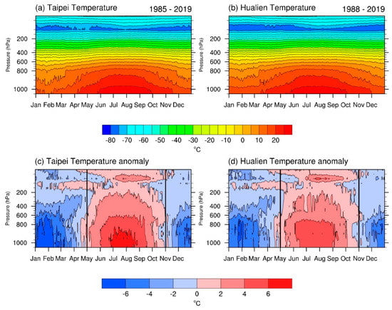 The vertical temperature profile of the atmosphere is obtained through analyzing the radiosonde data above the two stations. Climatological annual cycles of the vertical temperature profile above the Taipei and Hualien sounding stations during their respective operation periods are presented. Figure 3a,b are the sounding results above Taipei and Hualien, respectively, and they demonstrate much comprehensive and complete vertical information compared with the analysis from the surface-based meteorological observations. Both the Taipei and Hualien sounding results show similar patterns in terms of vertical change, presenting a steady cooling of temperature with the height below the layer of about 100 hPa and a clear reverse of lapse rate above that layer, which should be regarded as the end of the troposphere, namely the tropopause. It varies with seasons, reaching the highest layer at about 17.4 km during the boreal spring and the lowest at about 16.7 km during the boreal summer above Taiwan [].
