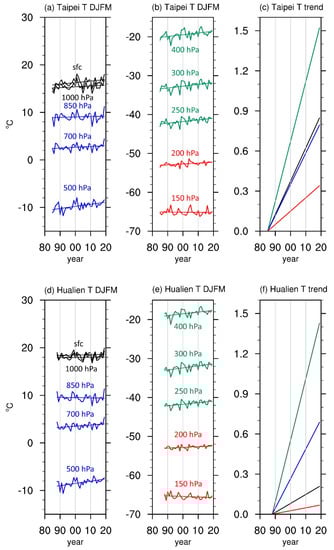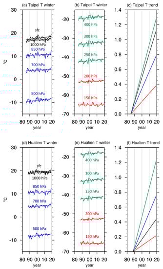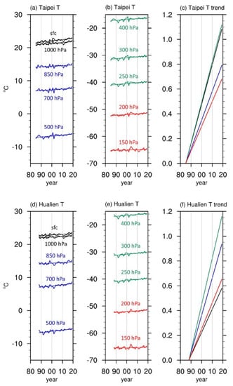 Since the 20th century, global warming has been a debatable topic across the scientific fields and wider society. Through investigations of long-term temperature variations, previous studies raised great concerns about global warming and increasing risks of encountering climate extremes together with associated hazards. Much of the previous literature discussed the general knowledge of global warming [] and the behavior change of meteorological systems under such warming [], while some studies described long-term changes at higher layers of the troposphere through model simulations or satellite observations. Elucidation by [] about long-term changes in the upper-tropospheric warming above tropical western Pacific was based on the ERA-Interim dataset and revealed maximum warming occurring between 400 hPa and 250 hPa, particularly during the boreal winter and early spring. Rather than applying model simulations, satellite-borne observations, or reanalysis datasets as the previous studies did, this study investigates local observational data in Taiwan, including long-term variations of temperature at various altitudes and pressure layers.