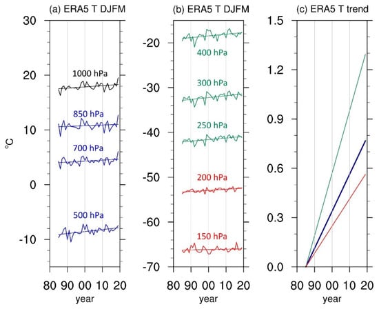 Decadal trend of the (a,b) mean temperature from December to next March (DJFM) at each pressure layer, (c) each group of pressure layers (subtracting the trend value of the first observation year) through the ERA5 data, unit: °C. The colors indicate the grouped pressure layers (black: 1000 hPa; blue: 850 hPa to 500 hPa; green: 400 hPa to 250 hPa; red: 200 hPa to 150 hPa). The thin line at each pressure layer denotes the corresponding trend of the variations.