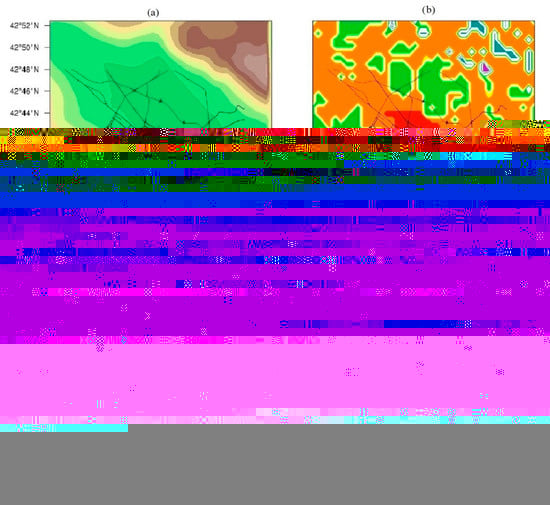The winter slight discomfort is almost the same in the whole domain. It changes with the elevation (Figure 1) in the transition seasons, with a higher frequency in the higher altitude areas. The risk of hypothermia in winter and spring also shows the increasing frequency with altitude. The risk of hypothermia during the autumn, as well as the risk of freezing in the winter and spring, are almost in the same frequency interval. The slight discomfort conditions in the 06 UTC show a little more complex picture, expressing a higher similarity with the changing of the elevation (Figure 1). The spatial distribution of the frequency of the risk of hypothermia, however, shows an opposite behavior—the distribution in 06 UTC is not as complex and similar to the elevation changes (Figure 1) as the whole one. The wind chill severity is highest in the 06 UTC than in the 15 UTC.