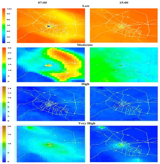 The annually averaged fields of recurrence of days with a certain air quality index are presented in Figure 2. In the “Low” category, the areas with a low air quality status are mainly the city’s ring road and busier transport routes, as well as the central parts, and they occur most in the morning hours. It is also observed in the “Moderate” band, early in the morning, with about a 20–30% recurrence of days with polluted air. In the afternoon in this category, there is pollution over Vitosha Mountain, which is probably due to the turbulent transport of ozone from higher levels in a turbulent atmosphere. The ozone in Bulgaria is largely due to transport from abroad [64]. This is one of the reasons, together with the ozone photochemistry reactions, why the ozone concentrations early in the morning are smaller than at noon (less intensive transport from higher levels) [40,41,42].