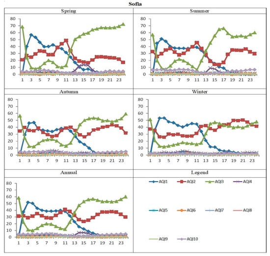 The graphs present the diurnal course and seasonal distribution of the average recurrences (in %) for the different pollution indices (from 1 to 10) for the territory of Sofia (Figure 3), as well as for different selected points of the city—Orlov Most (the city center) and Bistrica (a village in the surroundings of Sofia) (Figure 4 and Figure 5).