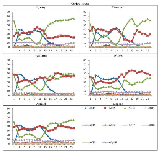 Figure 4 for the Orlov Most point shows that the indices AQI1, AQI2, and AQI3, which fall in the “Low” interval, have the greatest recurrence during the different seasons. The diurnal course of these indices is well defined. In the morning, AQI1 and AQI2 have a recurrence of about 40%, and in the afternoon, it drops to about 20%. At this time, AQI3 has a minimum recurrence in the morning and a maximum in the afternoon of about 50%. AQI4 has an afternoon maximum of about 10% in the spring and summer. In all the seasons, AQI10 stands out, which corresponds to the “Very High” category and, for this point, has a high repeatability of about 10%.