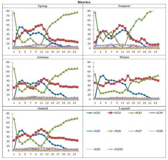 Figure 5, for the Bistritsa point, shows that the indices AQI1, AQI2, and AQI3, which fall in the “Low” interval, have the greatest recurrence during the different seasons. The diurnal course of these indices is well defined. In the morning, AQI1 and AQI2 have a recurrence of about 40%, and in the afternoon, it drops to about 20% during the warm months and back distribution during the cold months. At this time, AQI3 has a minimum recurrence in the morning and a maximum in the afternoon of about 50%. AQI4 has an afternoon high of about 10% in the spring. In all the seasons, AQI10 stands out, which corresponds to the “Very High” category and, for this point, has a recurrence of about 5% in the morning in all the seasons.