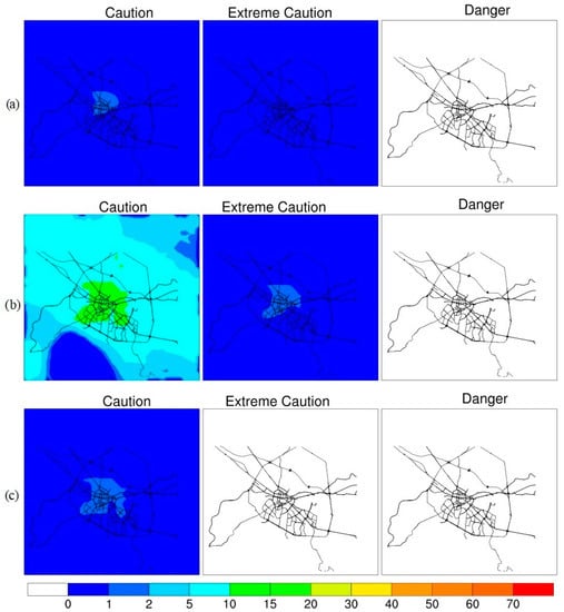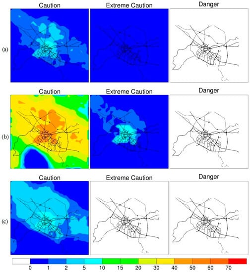The simulation results show that the distribution of the frequency of different HI categories is more diverse only in summer (Figure 6). The Caution cases were mostly between 0 and 1% and 1 to 2% in part of the more populated city area. There was no Extreme Caution in the autumn. That season, however, is characterized by more areas with Caution cases between 1 and 2%. During the summer, the probability of the health index “Caution” conditions is higher and has a more complex horizontal distribution. The central city parts had 10 to 15%. The percentages are between 5 and 10 in the other territories of the city limits and Sofia Valley as a whole and decrease with an increasing altitude. The spatial distribution of the Extreme Caution conditions in that season is more homogeneous, similar to the spring and autumn ones. There are no cases of Danger and Extreme Danger conditions over the three seasons, and the Extreme Caution conditions absent in the autumn. Therefore, the weather was not as extreme in the autumn as in the spring.