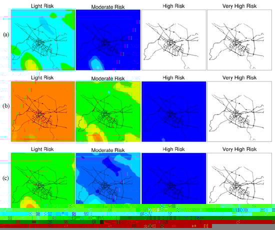 If the air temperature is below 26.6 °C and the relative humidity is below 40%, we use the air temperature as a heat index. The wind chill index [34] is studied for winter, spring, and autumn because these are the times when it is possible for these categories to be observed. It is reported in temperature units and is used as a wind chill temperature (WCT) with categories given in Table 4 [35]. The categories Very High Risk, Severe Risk, and Extreme Risk are combined in one category—“Very High Risk”, for the same reasons as in for the Danger and Extreme Danger heat index.