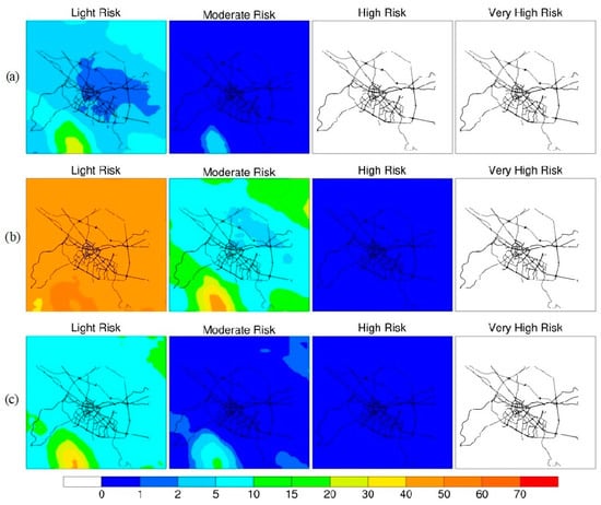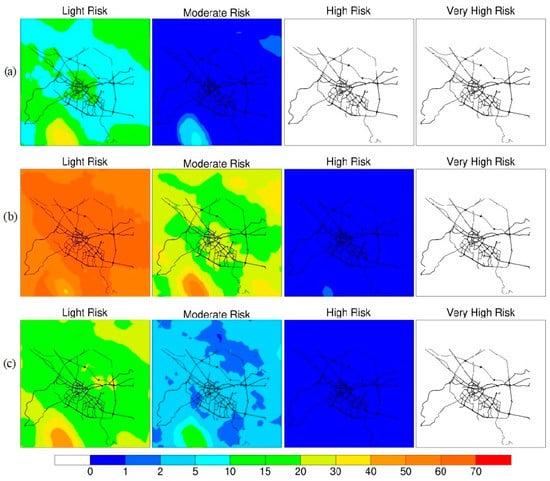 Frequency (in %) for (a) autumn, (b) winter, and (c) spring of the Wind-chill index categories “Low risk” (first column), “Moderate risk” (second column), and “High risk” (third column) in the Sofia region at 06 UTC during the autumn (first row), winter (second row), and spring (third row).